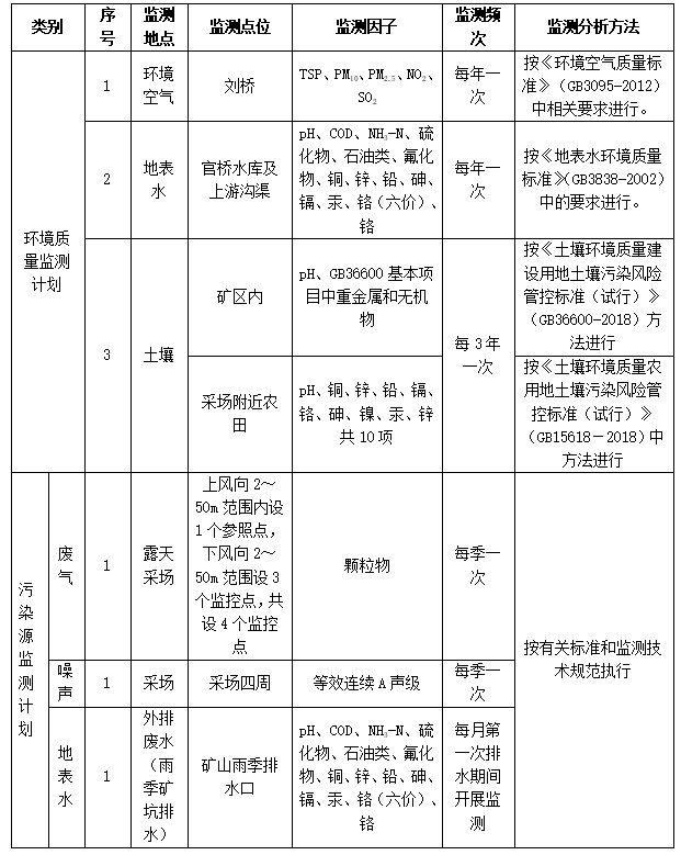 (6)招標(biāo)范圍及內(nèi)容:對(duì)興天礦業(yè)諭興礦進(jìn)行環(huán)境監(jiān)測(cè)和檢測(cè),包括但不限于土壤、地下水、廢水、廢氣、噪聲等污染源進(jìn)行監(jiān)測(cè)和檢測(cè),每季度出具監(jiān)測(cè)和檢測(cè)報(bào)告。監(jiān)測(cè)和檢測(cè)報(bào)告需滿足各級(jí)主管單位、國(guó)家法律法規(guī)、行業(yè)檢測(cè)標(biāo)準(zhǔn)、《滁州市興天礦業(yè)有限公司安徽省天長(zhǎng)市諭興地區(qū)建筑用玄武巖礦年產(chǎn) 800 萬(wàn)噸露天采礦項(xiàng)目環(huán)境影響報(bào)告表》中所涉及范圍等要求,保證審批順利通過(guò)。
