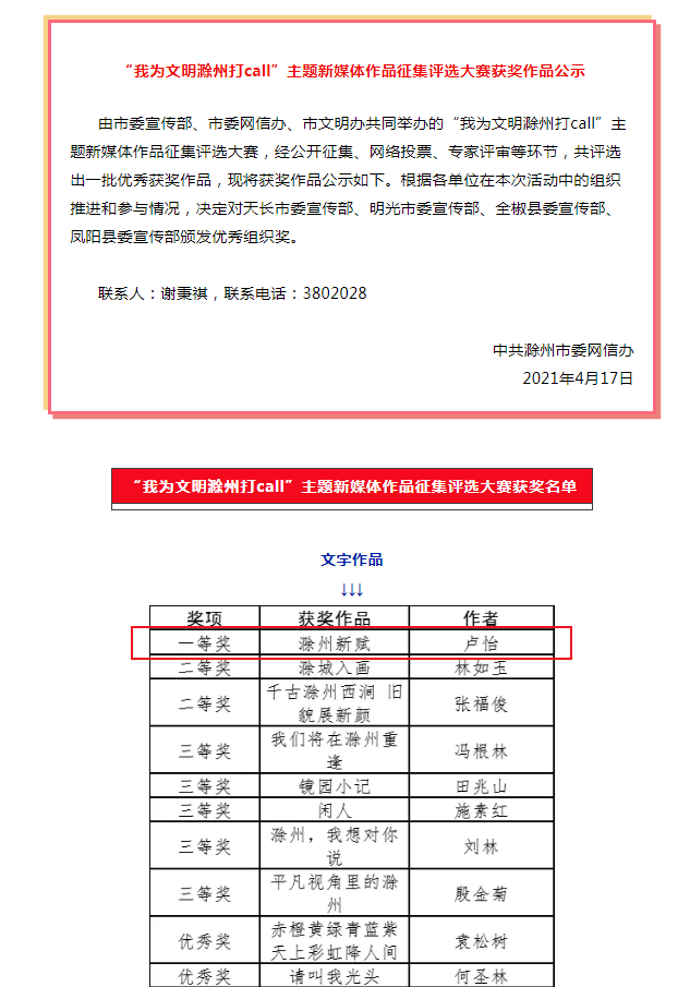 喜訊!我公司職工盧怡獲市委網(wǎng)信辦“我為文明滁州打call”主題新媒體作品征集評選大賽文字作品一等獎!