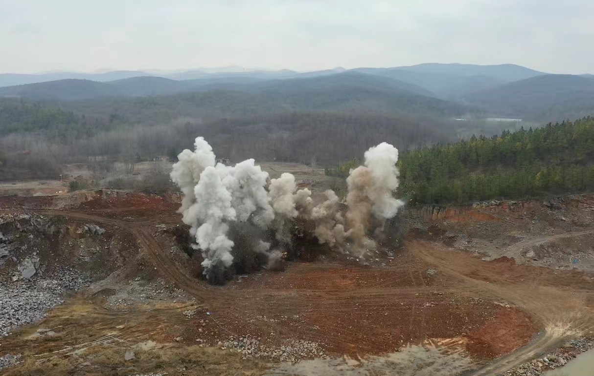 “3、2、1,起爆!”,2月18日(農歷正月十八)上午11時58分,伴隨“砰”的一聲巨響,安徽省全椒縣馬塘湖整合礦區(qū)建筑石料用灰?guī)r礦900萬t/a露天采礦工程順利完成首次爆破。